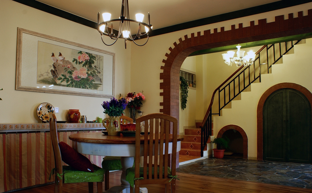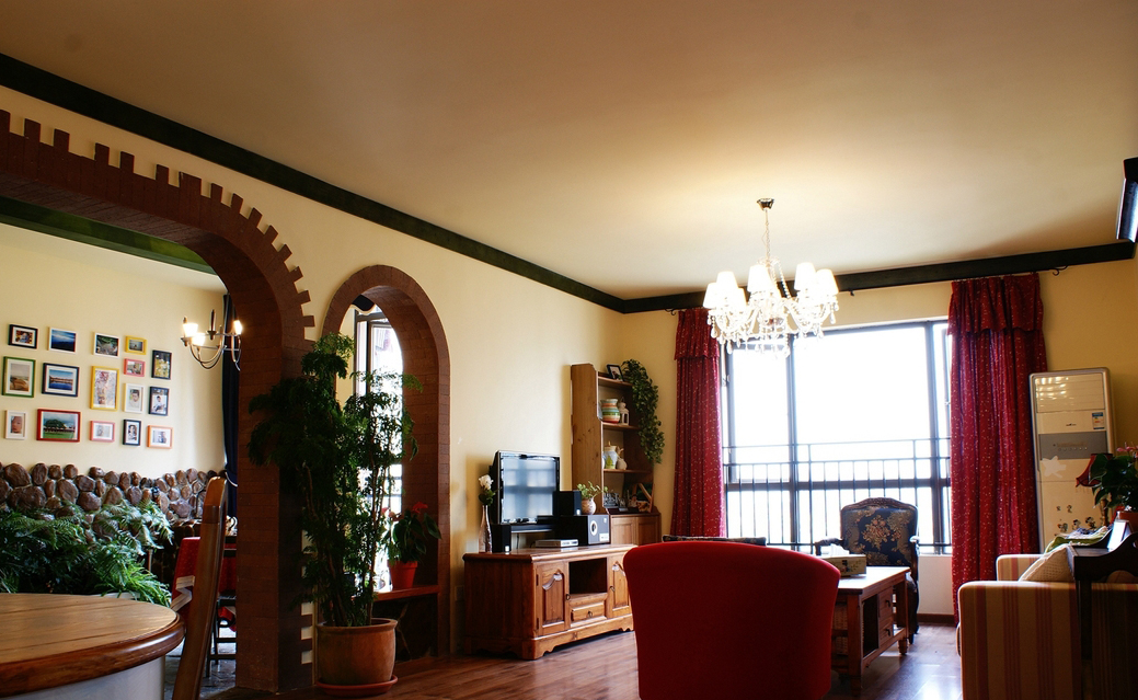 “北緯23.5度、南緯23.5度之間,分布著綠色宮殿般的熱帶雨林。從散布巖石小山的低地平原,到溪流縱橫的高原峽谷,參天的大樹、纏繞的藤蘿、繁茂的花草...多樣的地貌和植物,交織出形態萬千的雨林景觀...” “熱帶雨林季風氣候下,磚紅壤以顏色類似燒制的紅磚而得名。”整個設計思路,由熱帶雨林的這兩個特征全面展開...... 業主愛蜜蓮熱愛大自然,花草,書籍,電影,音樂...“軟裝飾設計環節”中的每樣配飾都極為重視和熱心(這是形成一個完整設計作品的關鍵環節)。步入愛蜜蓮的家,像進入一片熱帶雨林,大朵大朵花兒凝成了“熱情”的窗簾、沙發和臺布,精心挑選的植物和墨綠的原木裝飾,流動著綠意盎然的自然主義休閑精神......